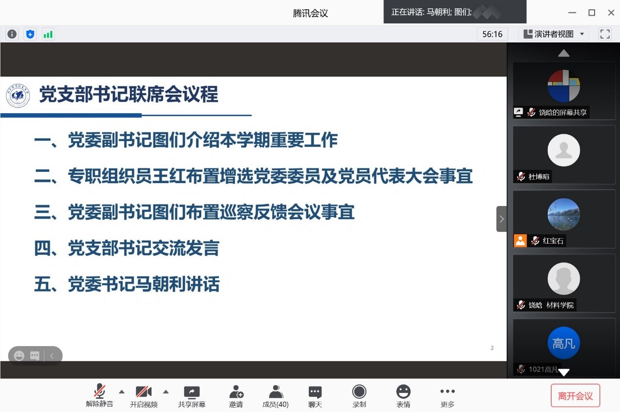 (通讯员 于万欣)10月11日上午,材料科学与工程学院党支部书记联席会通过腾讯会议平台顺利召开,党委书记马朝利、党委副书记图们、专职组织员王红、教职工党支部书记、学生党支部书记、各年级辅导员参会。