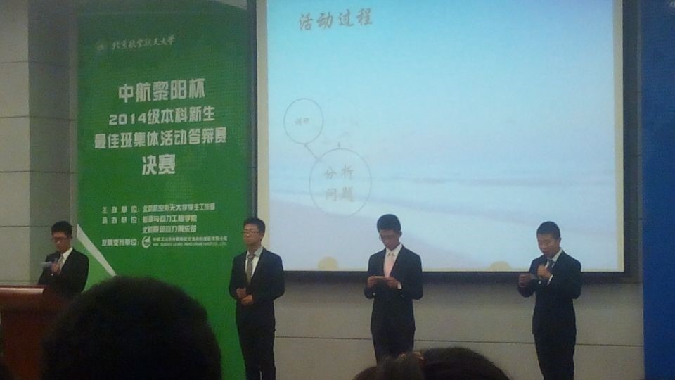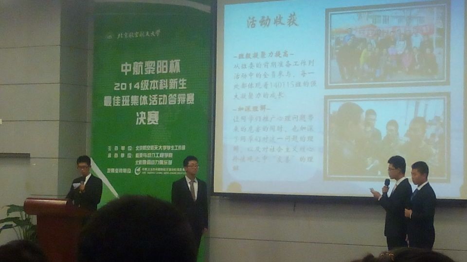 2014年11月26日晚19:00,中航黎阳杯新生优秀班集体答辩赛决赛在实验4号楼205教室顺利举行,本场比赛共有7位评委老师,14支参赛队伍,其中有2支参赛队伍来自材苑,另有约两百名观众见证了这一异彩纷呈赛事。 在主持人宣布决赛开始之后,一支支队伍相继上场,不断用自己最优秀的一面介绍自己班级的活动,展现自己班级的风采。材苑的两支队伍分别于第六与第八位上场。140112班先上场,在mentor杨林森轻松幽默的推荐之后,140112班的四位答辩选手就校园文明的风采与魅力进行了精彩的展示,并提出一些具有建设性的建议。随后的140115班则是在关贺学长真切的推荐话语中,对“关注大学生心理健康,缓解大学生心理压力”这一主题进行了内容翔实,鞭辟入里的介绍与分析,而“我们不是为了做活动而做活动,而是在活动中凝聚班级,在活动中展现风采”一句更是得到了评委老师的一致认同。 经过激烈的角逐,最终140112班获得了二等奖,奖金2500元;140115班获得了一等奖,奖金3000元,奖杯一个。 本次比赛历时两个月,材苑的学子们,无论是答辩选手,还是在幕后默默奉献,进行各种活动的其他同学,都收获颇丰。物质的奖励是次要的,奖杯的荣耀也只是一时的,而同学们能力的锻炼,知识的增长,意志的磨练,责任的感悟才是无价的收获。相信材苑的学子在未来的道路上一样能勇往直前,大放异彩。
