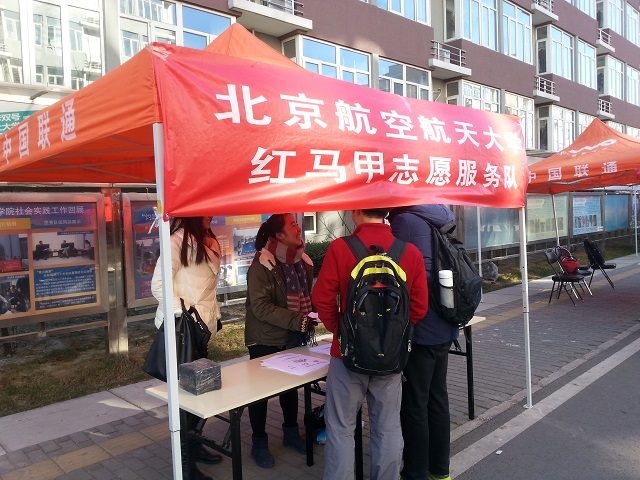 2014年12月5日,在世界志愿者日来临之际,北航红马甲志愿服务队在沙河校区举办相关宣传外场,外场现场吸引了很多同学的驻足,取得了很不错的效果。