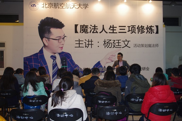 12月3日晚,由北航材料学院研会主办、北京京喜妤香化妆品公司协办以及多家主流媒体赞助的“魔法人生三项修炼”宣讲会成功举行,宣讲会邀请了活动策划魔法师杨廷文以及一位专业影视化妆师。