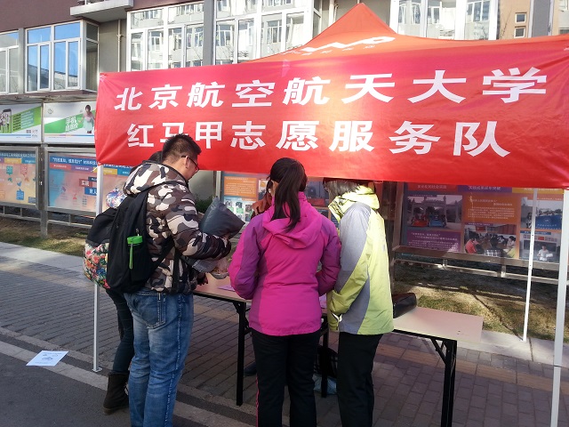 2014年12月5日,在世界志愿者日来临之际,北航红马甲志愿服务队在沙河校区举办相关宣传外场,外场现场吸引了很多同学的驻足,取得了很不错的效果。